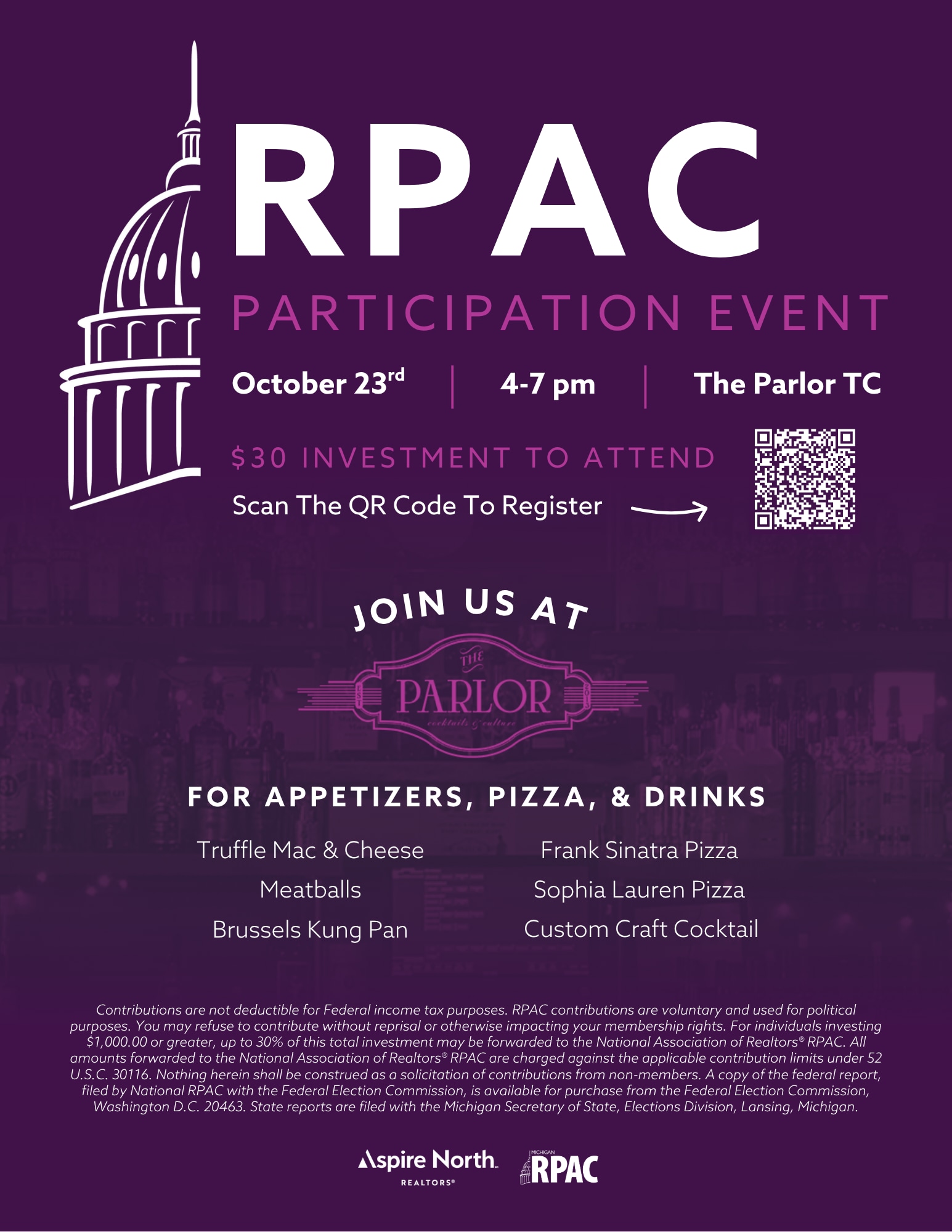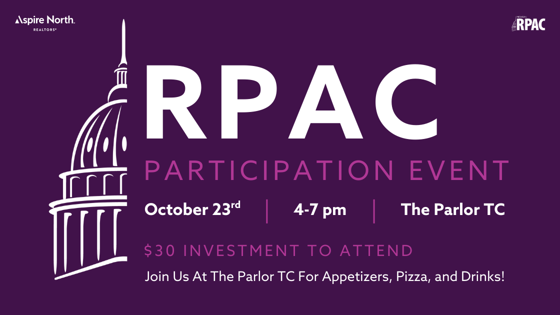 You're invited to an evening of great food and even better company at our RPAC Participation Event on October 23rd from 4–7 PM at The Parlor TC. Enjoy delicious appetizers and pizza and drinks, while supporting RPAC’s mission to advocate for real estate professionals.