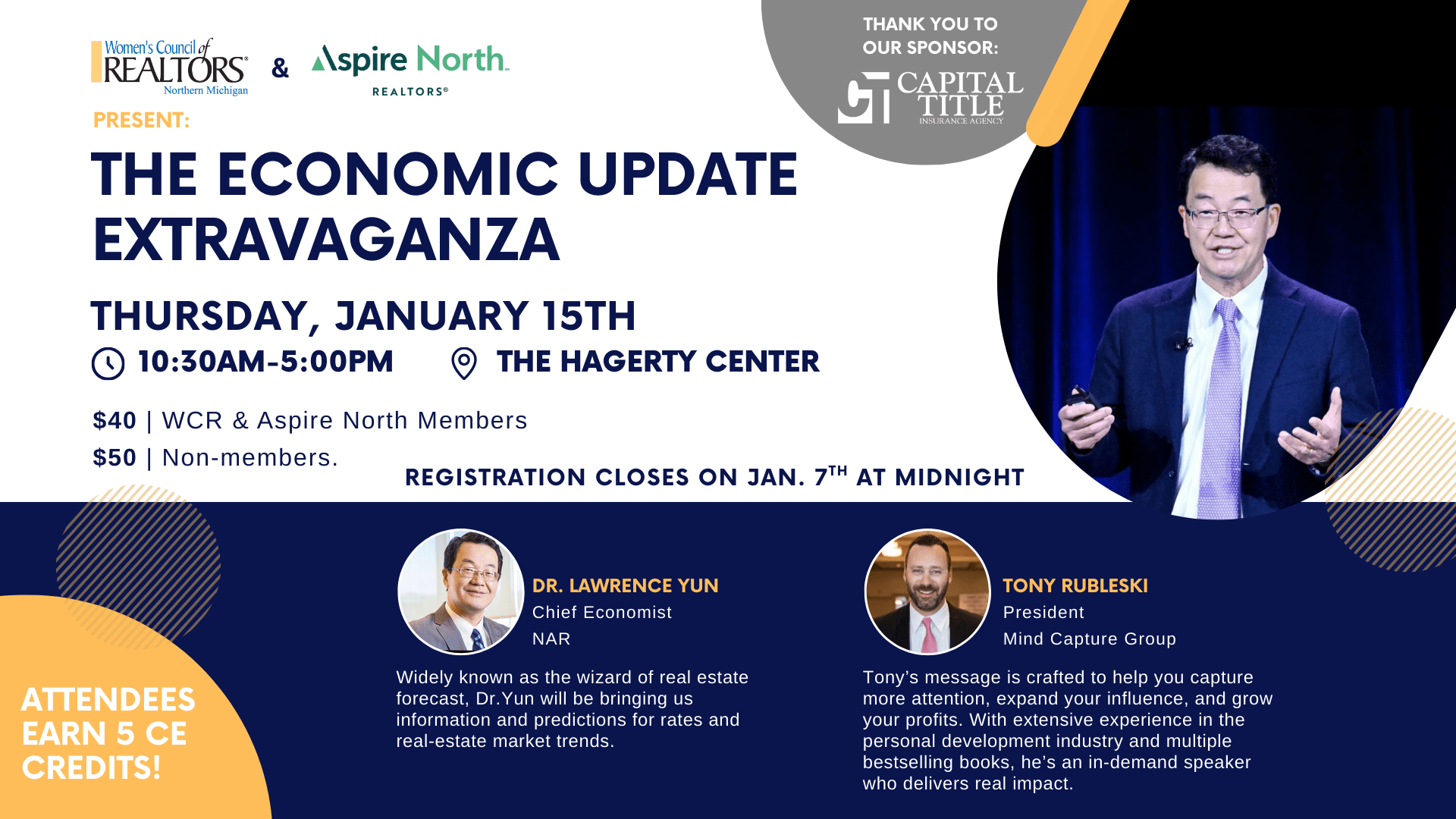 Joining him is Tony Rubleski, a bestselling author and high-demand speaker known for energizing audiences with his sharp, mindset-shifting marketing expertise. Together, they deliver an unbeatable combination of data-driven economic clarity and actionable business inspiration. With this level of talent in one room, this is truly a can’t-miss event for anyone serious about staying ahead in their business. We want to thank Capital Title for sponsoring this event.